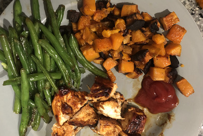 DinnerBBQ ChickenOn this pageBBQ Chicken Ingredients BBQ Sauce Chicken Directions Marinate chicken in bbq sauce for 1 hour before cooking Sear chicken on high heat in a pan on both sides, then lower heat to low-medium with a lid to fully cook chicken Serve with sides